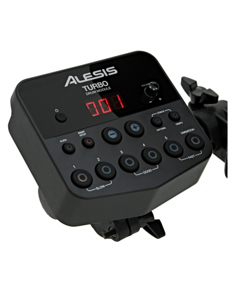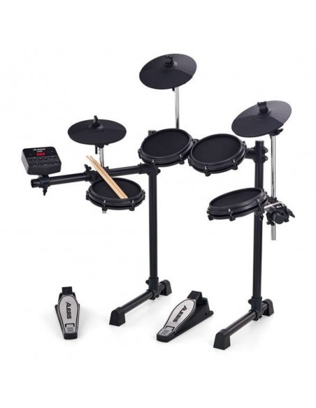 | I 4 pad da 8" dedicati al rullante ed ai 3 tom montano tutti pelli di tipo mesh che minimizzano il rumore ambientale e rendono più naturale la risposta al colpo delle bacchette. Tre sono i pad dedicati ai piatti (hi-hat, crash e ride) tutti da 10", due i pedali progettati da Alesis dedicati al controllo dell'hi-hat ed al controllo del suono della cassa. Il tutto è installabile sul robusto e stabile rack in alluminio incluso nella confezione, insieme alle bacchette ed ai cavi per il collegamento dei trigger pad al modulo sonoro. |