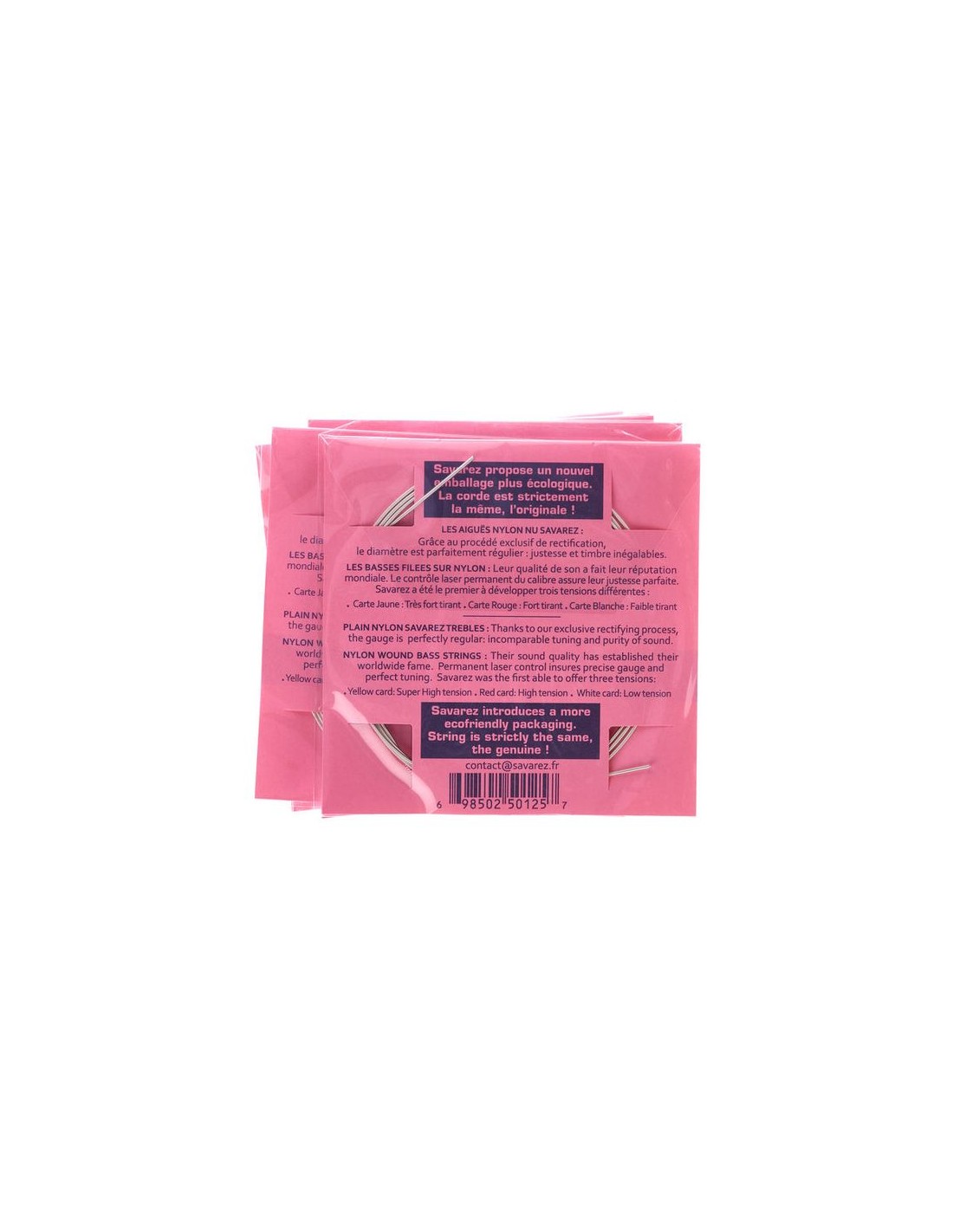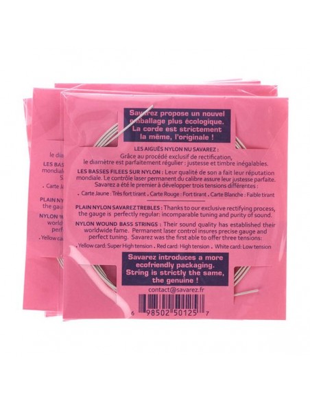 Le Savarez alte sono fatte di nylon rettificato caratterizzato da una caratteristica finitura non lucidata. Questo granulosità contribuisce ad una diminuzione delle tonalità alte. A causa della loro consistenza, le corde alte sono particolarmente controllabili per ciò che riguarda bending e stabilità. Le caratteristiche del loro suono rendono la timbrica particolarmente nitida e vera. I bassi sono caldi e morbidi, il loro suono è forte nel complesso. |