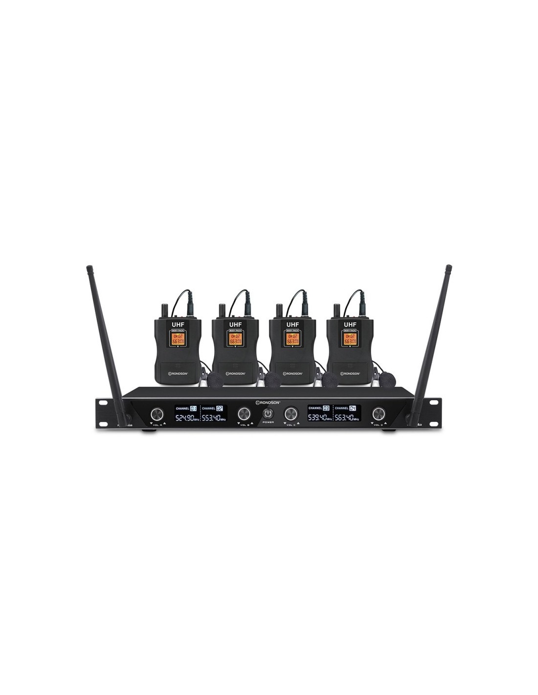 Rondson BE-1040/4BP è un sistema microfonico wireless UHF composto da quattro trasmettitori da tasca completi di microfoni ad archetto e un ricevitore a quattro canali montabile in una unità rack 19". Compatto e di semplice utilizzo offre un'eccellente qualità dell'audio. Il ricevitore è dotato di moduli riceventi PLL sintetizzati selezionabili. |